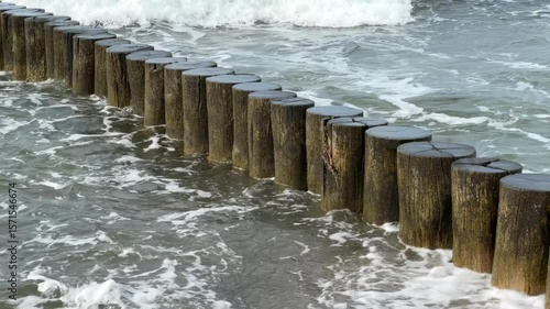 Waves crashing in slow-motion against wooden groins in the Baltic Sea at Graal-Müritz, Germany.