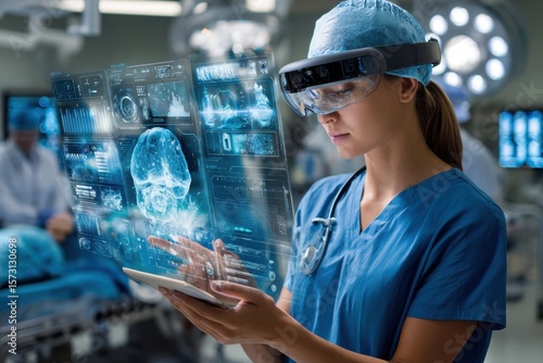 Modern laboratory scene featuring a female scientist using advanced virtual reality equipment