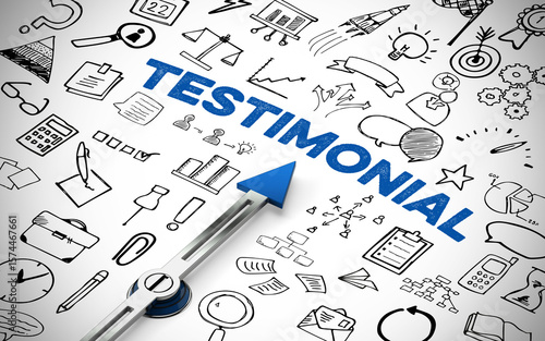 Kompass zeigt auf Schriftzug Testimonial zwischen Icons als Business Konzept