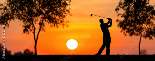 A golfer practices a swing during a sunset on a grassy course