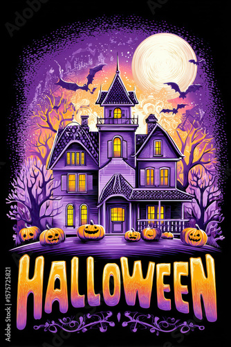 Haunted house surrounded by jack-o'-lanterns with bats and a full moon