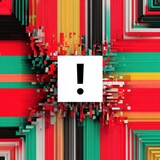 Vibrant abstract composition with a white card and exclamation mark amid colorful glitch patterns