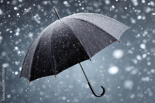 Close-up of a rainy weather umbrella covered with snow and water droplets