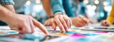 Teamwork Brainstorming Session Hands Pointing at Colorful Designs on Table with Tablets for Creative Collaboration and Planning