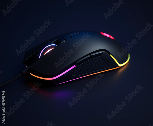 Elegant black gaming mouse showcases vibrant RGB lighting accents against a dark backdrop, appealing to esports enthusiasts and tech consumers seeking high performance peripherals for their setup. #1579713743
