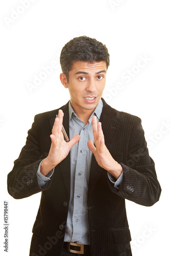 Geschäftsmann gestikuliert bei einem Vortrag