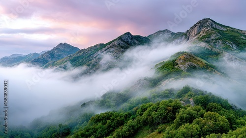 Mist rolling over mountain peaks with lush green forest and sunrise light