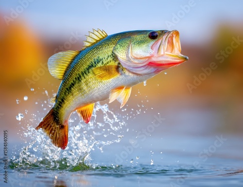 Bass fish leaps gracefully from water, showcasing vibrant scales and natural scenery