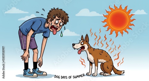 Cartoon Illustration of Sweaty Person and Panting Dog Under Blazing Sun with “Dog Days of Summer” Text — Humorous Seasonal Concept Depicting Extreme Heat, Summer Fatigue, and Pet Care Awareness #1585958997