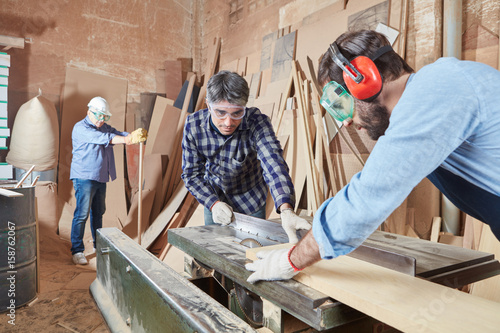 Zwei Tischler arbeiten mit Holz und Kreissäge