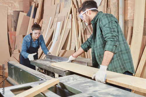 Zwei Tischler arbeiten mit Holz und Kreissäge