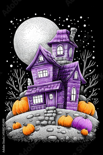 Whimsical Halloween scene with haunted house and pumpkins at night