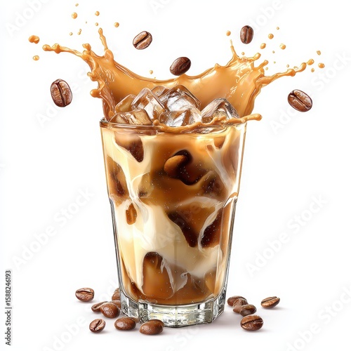 Refreshing iced coffee splash with beans and milk swirl in a glass