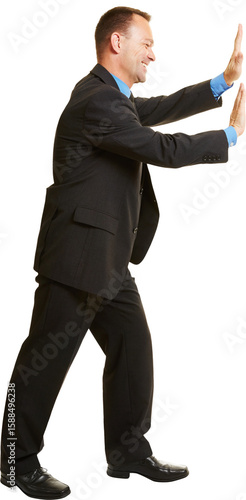 Geschäftsmann im Profil schiebt oder drückt imaginäre Wand