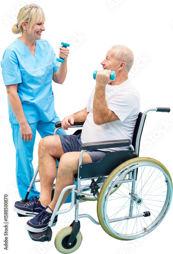 Seniorin im Rollstuhl trainiert Fitness mit Hanteln