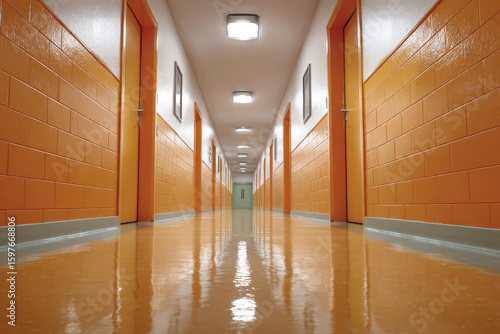 Brightly lit long hallway with reflective orange walls and doors