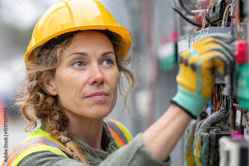 Female electrician wearing safety gear adjusting wiring on an electrical panel