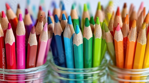 Variety of colorful pencils organized neatly in transparent glass jars on desk