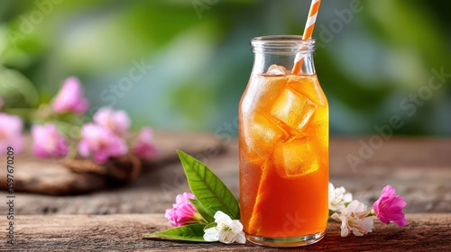 Refreshing iced tea in a glass bottle with tropical flowers and greenery