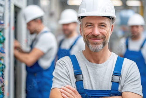 Portrait of a smiling engineer standing confidently in a workshop setting