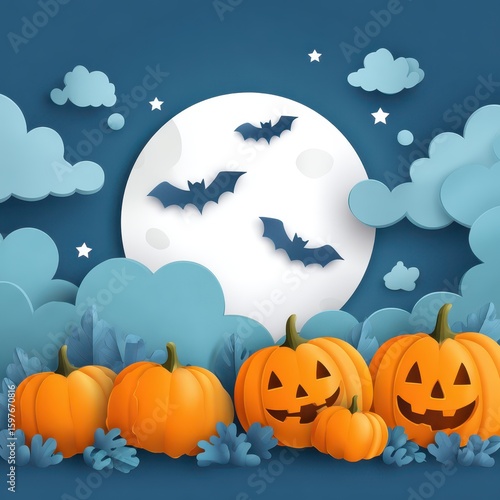 Halloween night scene with pumpkins, bats, moon, and clouds in art style