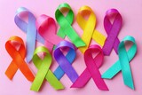 Colorful Awareness Ribbons On Pink Background For Healthcare Charity Support And Cancer Campaigns Symbolizing Hope And Solidarity For Important Causes