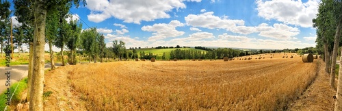 Panoramic landscape with rural fields, trees and hay bales under a blue sky