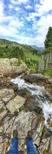 Panoramic view of alpine landscape with flowing stream and lush greenery