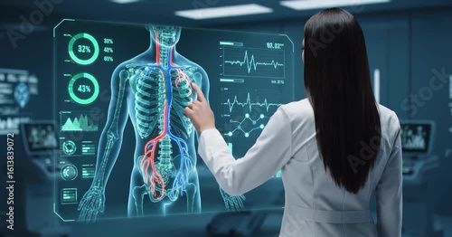 A doctor analyzing a human body X-Ray holographic screen display. The concept of futuristic medical diagnostics, advanced healthcare technology, and precision medicine. Generative AI. #1613839072