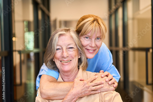 Friendly caretaker hugging elderly woman in a senior care facility