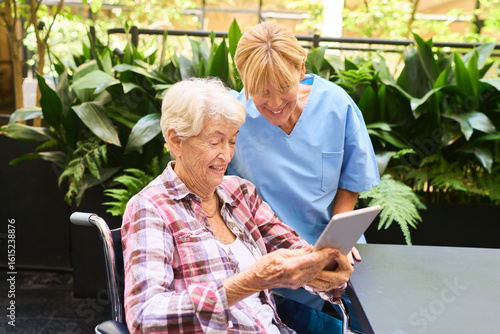 Nurse assisting senior in wheelchair with a digital device outdoors