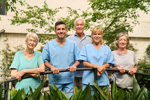 Friendly staff and seniors enjoying nature at a rehabilitation facility