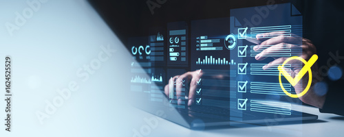 High-tech business analytics dashboard displayed on a widescreen monitor in a modern office setup.
