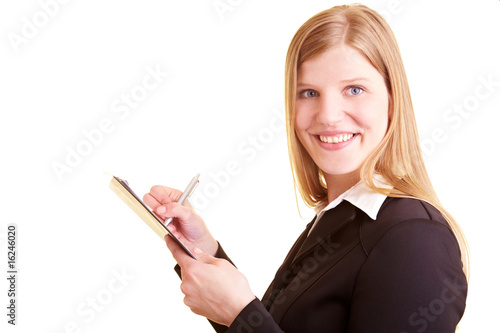 Junde blonde Frau im Jackett macht Häkchen auf einem Klemmbrett