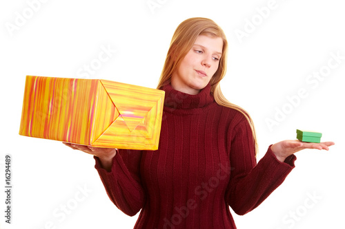 Junge Frau mit rosa Pullover vergleicht zwei Geschenke