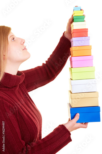 Junge blonde Frau trägt lachend viele bunte Geschenkschachteln