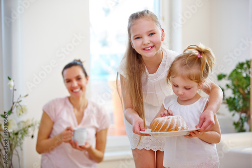 Familie mit Kuchen zu Hause im Wohnzimmer