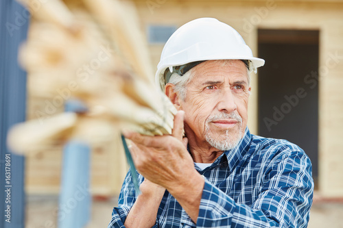 Senior Handwerker trägt Holz auf Baustelle