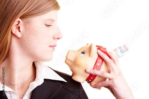 Erfolgreiche Frau mit Sparschwein auf Schulter