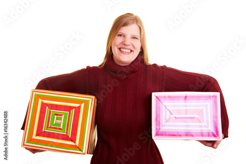 Junge blonde Frau hält viele bunte Geschenkschachteln