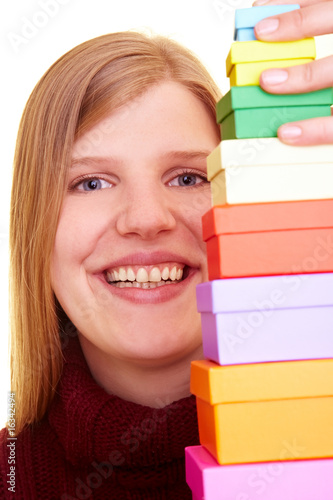 Junge blonde Frau balanciert einen Turm aus Geschenkschachteln