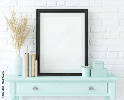 Interior Mockup With Frame Shelf Chair Vases Books Mugs Against Dark Wall For Art Display And Home Decor