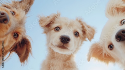 Playful puppies looking down together against a clear blue sky