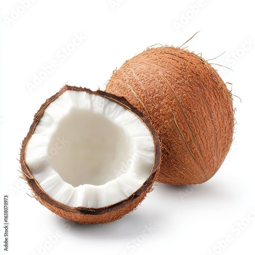 Fresh coconut fruit halves isolated on a clean white background
