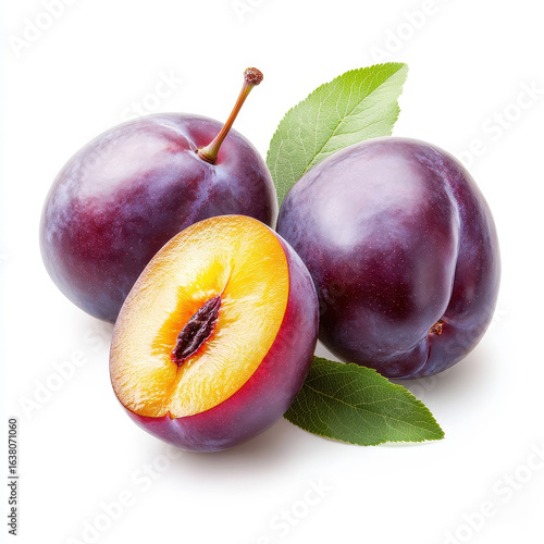 Fresh and Juicy Purple Plums with Green Leaves on White Background