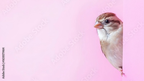 Curious sparrow peeking around a pink corner with vibrant surroundings