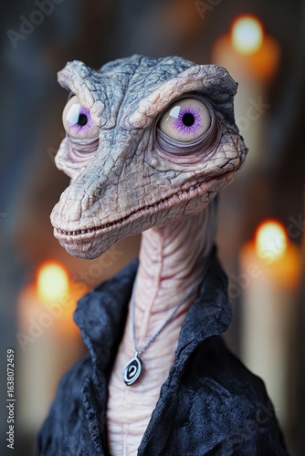 Realistic portrait of a mysterious reptilian creature with glowing purple eyes