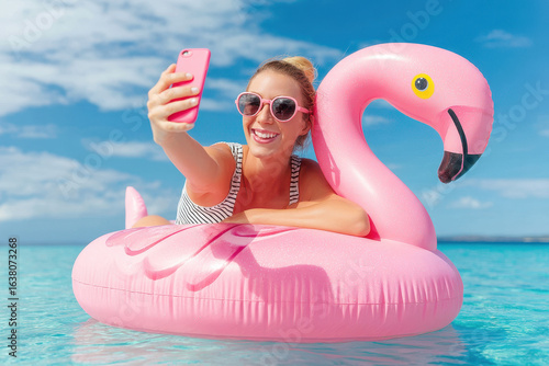 Woman taking a selfie on an inflatable flamingo in a sunny ocean