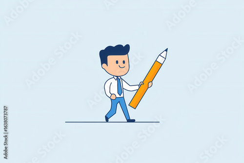 Smiling cartoon man carrying a large pencil while walking forward