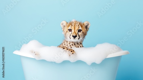 Cute cheetah cub enjoying a bubble bath in a blue bathtub